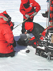 Du 24 novembre 1957 au 2 mars 1958, l'expédition Fuchs-Hillary traverse pour la première fois le continent par voie terrestre. Le déplacement s'effectue avec autoneiges américaines Tucker Sno-cat Corporation[21]. Des relevés sismologiques, gravimétriques entre autres sont effectués tout au long de l'expédition. Aussi, des mesures sont aussi prises pour mesurer l'épaisseur de glace au pôle Sud et vérifier la présence du continent sous celle-ci.
