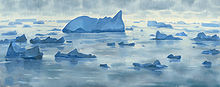 Sur le continent lui-même, la grande quantité de glace représente à peu près 70 % des réserves d'eau douce de la planète[24]. L'inlandsis prend constamment de la glace provenant des chutes de neige et en perd par la fonte puis l'écoulement de celle-ci vers la mer. L'Antarctique occidental connaît aujourd'hui une fonte des glaces qui fait augmenter le niveau des mers au fil du temps. Une revue d'étude scientifique qui consultait des données recueillies de 1992 à 2006 suggéra qu'une perte nette d'environ 50 gigatonnes de glace par an était une estimation raisonnable (cela représente une élévation d'environ 0, 14 mm du niveau de la mer) [40]. L'accélération énorme de la fonte des glaces dans la mer d'Amundsen a peut-être fait doubler ce chiffre pour 2006[41].