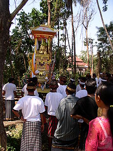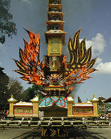 Hindouistes, les Balinais procèdent à la crémation de leurs morts. Cette circonstance est l'occasion de ce qui a toute l'apparence d'une fête, avec défilé dans la ville, musique de gamelan, offrandes de toutes natures déposées sur le catafalque du défunt avant la crémation dans une ambiance bon enfant et décontractée.