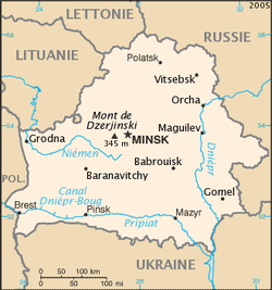 La Biélorussie, aussi nommée Belarus et Bélarus, en biélorusse Беларусь, en russe Беларусь, en forme longue la République de Biélorussie, République du Belarus ou République du Bélarus, en biélorusse Рэспубліка Беларусь, en russe Республика Беларусь, est un pays d'Europe orientale sans accès à la mer, bordé à l'ouest par la Pologne, au nord par la Lettonie et la Lituanie, à l'est par la Russie et au sud par l'Ukraine.