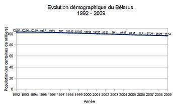En 2005, la Biélorussie comptait 10 350 194 habitants dont 78 % de Biélorusses, 13 % de Russes, 5 % de Polonais et 2, 3 % d'Ukrainiens. Les 0-14 ans représentent 16 % de la population, les 15-64 ans 68, 21 %, les plus de 65 ans 14, 6 %. L'espérance de vie est de 63 ans pour les hommes et 75 ans pour les femmes. Le taux de croissance de la population est de 0, 4 %. La natalité est de 10, 83 % pour 1, 4 enfant par femme, la mortalité de 14, 15 %. La mortalité infantile est de 13, 37 %. Le taux de migration est de 2, 42 %.