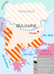 En 717, les Bulgares contribuent à sauver Byzance des assauts arabes. Le khan Tervel est nommé par ses contemporains «le Sauveur d'Europe». [8] Entre 861 et 864, la Bulgarie embrasse la foi orthodoxe, adopte le slavon comme langue usuelle et officielle et atteint sa plus grande extension territoriale sous Siméon, premier tsar. Mais au Xe siècle, en 969, l'empereur byzantin Basile II (surnommé «Bulgaroctone», le «Tueur de Bulgares»), allié aux Russes de Kiev, attaque la Bulgarie. En 971, il prend Preslav, la capitale, et , en 1018, il met fin au premier Tzarat et réincorpore les anciens territoires de la Bulgarie dans l'Empire romain d'Orient.