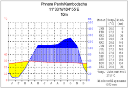 Le pays est localisé en basse altitude soit au niveau du fleuve ou encore plus bas ce qui fait que la saison des pluies fait augmenter le niveau des lacs et du fleuve principal ; le Mékong. Les températures s'échelonnent entre 10 °C et 38 °C. Le Cambodge est sous l'influence d'un climat tropical à «saisons alternées». Les pluies s'échelonnent de mai à novembre. La sécheresse, quant à elle , est presque absolue entre décembre et avril.