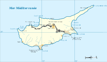 D'une superficie 9 250 km² (dont 3 355 km² dans la partie militairement occupée par la Turquie), l'île de Chypre est localisée dans la partie orientale de la Méditerranée. Elle comporte 648 km de littoral. Le point culminant de l'île est le mont Olympe avec ses 1 951 m. Quoiqu'étant une île, Chypre possède à peu près 150 km de frontière terrestre avec les bases militaires britanniques d'Akrotiri et Dhekelia[16].