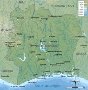 Le territoire de la Côte d'Ivoire présente l'aspect d'un quadrilatère, dont le sud offre une façade de 520 km sur l'océan Atlantique, dans la partie occidentale du golfe de Guinée. Le pays est caractérisé par un relief peu élevé. Les terres sont constituées en majeure partie de plateaux et plaines. L'ouest du pays, région montagneuse, présente cependant quelques reliefs au-delà de mille mètres (le mont Nimba culmine à 1 752 m[7]). Hormis cette région, les altitudes fluctuent le plus souvent entre 100 et 500 mètres, la majorité des plateaux se situant autour de 200 à 350 mètres. Ceux-ci présentent différents aspects. Les plateaux les plus élevés sont rigides dans leurs formes mais aussi dans leurs matériaux ; ceux de niveaux intermédiaires ont assez fréquemment des formes émoussées ; les plus bas présentent quant à eux une certaine rigidité, mais sont constitués de matériaux meubles. Des étendues énormes et verticales rigoureusement tabulaires et horizontales sont quelquefois présentes dans les régions de savanes, mais également sous les petits accrocs de savanes incluses dans la forêt dense. L'élément dominant de ces plateaux est constitué par une cuirasse ferrugineuse visible en surface sous forme de dalles de teinte rouille, mais quelquefois voilées de sables, de gravillons ou produits plus fins[8].