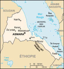 L'Érythrée, en forme longue l'État d'Érythrée ou la République d'Érythrée, en arabe Iritrīyā, ?????? et Dawlat Iritrīya, ???? ??????, en tigrinya Ertrā, ኤርትራ et Hagere Ertrā, ሃገረ ኤርትራ, en anglais Eritrea et State of Eritrea, est un État indépendant de la Corne de l'Afrique voisin du Soudan à l'ouest , de l'Éthiopie au sud et de Djibouti à l'est . Il a acquis son indépendance de l'Éthiopie en 1993. Depuis, les deux pays se livrent une guerre sporadique. L'Érythrée doit son nom à Francesco Crispi[2], président du conseil italien, à partir de la racine grecque eruthros signifiant «rouge», probablement en référence à la Mer Rouge.