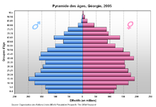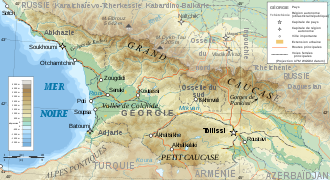 La Géorgie a des frontières avec la Fédération de Russie au nord, l'Azerbaïdjan à l'est , l'Arménie au sud et la Turquie au sud-ouest . Le pays couvre un territoire de 69 000 km² ; sa population, sans compter l'Abkhazie et l'Ossétie du Sud est de 4, 4 millions d'habitants, avec à peu près 84 % de Géorgiens ethniques.