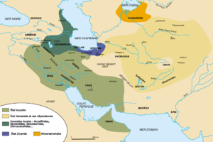Au VIIIe siècle, le Khorassan se rallie à la doctrine dissidente du chiisme et s'émancipe de la domination arabe. Une révolte renverse la dynastie Omeyyade, installant les Abbassides à Bagdad en 748[24]. Le pouvoir des califes diminue progressivement, et plusieurs dynasties régionales émergent en Iran entre 820 et 1005, dont les Samanides. Ces derniers rivalisent avec Bagdad, et créent d'importants foyers de vie intellectuelle. Outre la culture arabe classique, ils facilitent l'éclosion de la littérature persane et accordent leur protection à des penseurs. En 962, la dynastie Ghaznévides s'installe à Ghazna et régne du Khorasan au Panjâb. C'est sous le patronage de Mahmûd de Ghaznî que Ferdowsi écrit en persan le Shâh Nâmâ (signifiant «Le livre des Rois»), poème épique qui recueille les histoires de la mythologie perse[25].