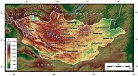 Une partie du pays est constituée de steppes. La désertification touche 140 000 des 1 565 500 km²[3]. Le Désert de Gobi recouvre une partie du sud du pays, tandis qu'au nord ainsi qu'à l'ouest , se trouvent des régions montagneuses aux forêts abondantes. Le point culminant du pays est le Nayramadlin Orgil (Huyten Orgil) à 4374 m.