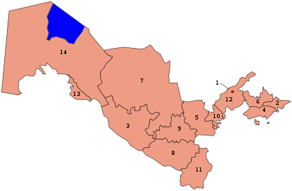 La République d'Ouzbékistan est divisée en 12 régions (en ouzbek : viloyat), une ville (shahri) et une république autonome de Karakalpakistan (respublikasi) :