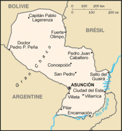 Le Paraguay, en forme longue la République du Paraguay, en guarani Paraguái, en espagnol República del Paraguay, est un pays et Etat souverain enclavé d'Amérique du Sud localisé dans la partie centrale de ce continent. Son territoire compte deux régions différentes scindées par la rivière río Paraguay : la partie orientale, qui est la plus peuplée, et l'occidentale, qui intègre le Chaco Boreal. Entouré par l'Argentine, le Brésil et la Bolivie, il occupe une superficie de 406 750 km². Le pays compte 6 347 884 habitants en 2005. Sa capitale est Asunción.