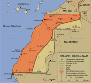 Les zones de contrôle du Maroc et du Polisario sont scindées par un mur de sable, construit par les Marocains avec l'aide d'Israël et des États-Unis[27]. La zone sous contrôle marocain se trouve à l'ouest du mur, la zone sous contrôle du Polisario à l'est . Le mur mesure plus de 2 000 km de long et sert à bloquer les véhicules. Il se compose d'une série de barrières fait de deux remblais de sable de 3 m de haut protégés par des champs de mines et de fortifications positionnées l'ensemble des cinq kilomètres[28].