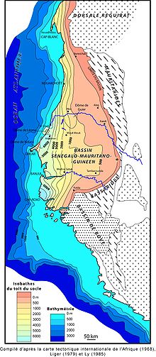Appuyé sur le Craton ouest-africain, le bassin côtier accumule une puissante série sédimentaire, d'origine essentiellement marine, qui commence au Trias-Lias et se termine au Miocène. Depuis la limite orientale du bassin, proche de Bakel, les dépôts s'épaississent vers l'ouest , en premier lieu progressivement, puis, passant une flexure située entre 15°30'W et 16°30'W (Spengler et al., 1966[16] ; Latil-Brun et Flicoteaux, 1986[17]), leur puissance augmente rapidement, pour atteindre, à Dakar, des puissances de plus de six à sept mille mètres (Castelain, 1965[18] ; Spengler et al., 1966). En Casamance, les profondeurs estimées dépasseraient huit mille mètres.