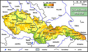 Créée sur les décombres de l'Empire austro-hongrois, la Tchécoslovaquie regroupe en un même État Tchèques et Slovaques, deux peuples de langue proche, avec Prague pour capitale. Ses frontières avec l'Autriche et la Pologne sont fixée par le Traité de Saint-Germain-en-Laye[3] le 10 septembre 1919[4] et avec la Hongrie par le Traité de Trianon[5].